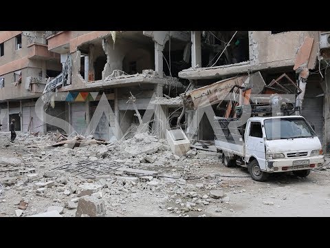 آثار الدمار جراء قصف صاروخي على مدينة عربين شرق دمشق